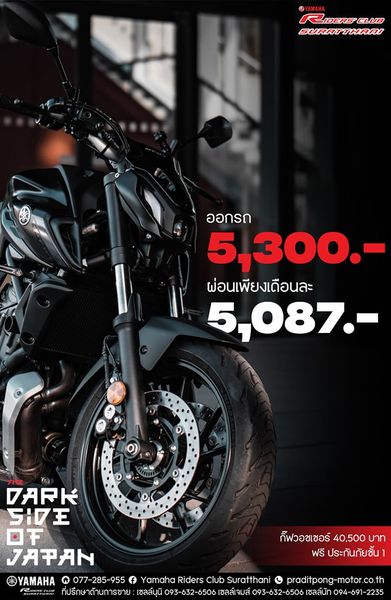 ออกรถ 5,300.-/ผ่อนเพียง 5,087บาท x60งวด YAMAHA MT-07 2023 กิ้ฟ 40,500 บาท ป.1 ราคารถ 305,000 บาท ดาวน์15% 5,300.- (หักส่วนลด) ผ่อน 5,087 x60งวด ดาวน์ 20% 20,500.- (หักส่วนลด) ผ่อน 4,789 x60งวด อยากได้ คำปรึกษา ติดต่อเซลล์ : 093-6529397 (Sale นุนิ) : https://line.me/ti/p/jP9FMVVKa9 . 094-691-2235 (Sale นัท) https://line.me/ti/p/HyJWRjMlID . : 093-6326506 (Sale เจมส์) : https://line.me/ti/p/VowbBTV5m5 Showroom Tel. 077-285955 กด 2 เปิดบริการทุกวัน จ.-ส. เวลา 8.00 -17.00 น. Google Map : https://goo.gl/maps/7ktFzehHDuYFzfAB6 #MT07 # #Yamahabigbike #YAMAHA #YRCsurat #YamahaRidersClubSuratthani Post Views: 507 Post navigationPreviousPrevious post:Yamaha YZF-R7 White Pearl NextNext post:ออกรถเพียง 5,900บาท #MT09 DEMORelated posts”YAMAHA YZF-R7 สปอร์ตคลาสกลางตัวตึงเครื่องยนต์ CP2′23/08/2024MT-07 #ออกรถไม่ต้องใช้เงินดาวน์ ฟรีดาวน์ 15%06/08/2024Sport หรือ Naked โปรแรงที่ไม่ยอมกัน รถพร้อมส่งมอบทั้ง 2 รุ่น Yamaha YZF-R7 และ Yamaha MT-0722/07/2024ออกรถวันนี้รับข้อเสนอสุดแรง GIFT VOUCHER 41,000 บาท พร้อม ฟรี ประกันภัยชั้น 122/07/2024โปรโมชันสุดแรงจาก Yamaha Riders’ Club ส่วนลดสูงสุด 120,000 บาท พร้อมฟรีประกันชั้น 116/07/2024New color Tmax Techmax ( สีน้ำตาล ) มีรถพร้อมส่ง26/12/2023